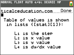 Utilizes the STAT lists to give a rate of change approximation table using Euler's Method given the inputs typically provided in an Euler's problem.