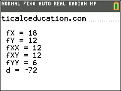 Calculates the partial derivatives of a two-variable function in the direction of x and y, the second partials taken in all directions, and the value of d to determine extrema and saddle points.