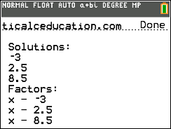 Solves and factors second degree polynomials given the input of it's coefficients. Change your [mode] to a+b𝒾 to view nonreal answers.