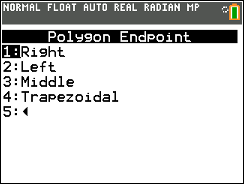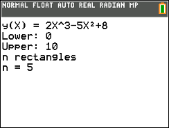 Estimates the area under a curve using Riemann Sums with left, right, center, or trapezoidal endpoints given inputs of bounds and number of figures.
